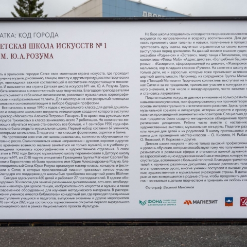 В рамках цикла «Сатка: код города» на площади ДК «Строитель» открылась новая экспозиция, посвященная 75-летию Детской школы искусств №1 имени Ю. А. Розума. Выставка приглашает жителей и гостей города окунуться в яркую и богатую на события жизнь этой небольшой «страны искусств».
