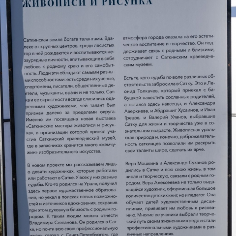 Центральное место среди представленных работ занимают виды Сатки, её окрестностей и жителей не случайно. Для кого-то из авторов город стал колыбелью, давшей начало жизни и творчества, для кого-то - второй родиной, в которой окреп и расцвёл их талант, и для каждого - местом силы, источником вдохновения. Рассматривая фотографии картин и рисунков, мы, как в зеркале, видим в них отражение внутреннего мира художников, их гордость за родную землю и любовь к землякам. А краткие биографии героев экспозиции помогают ещё лучше понять людей, глазами которых мы видим Сатку, узнать истории, которые стоят за произведениями.