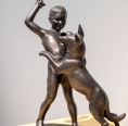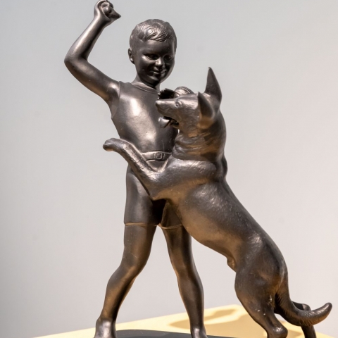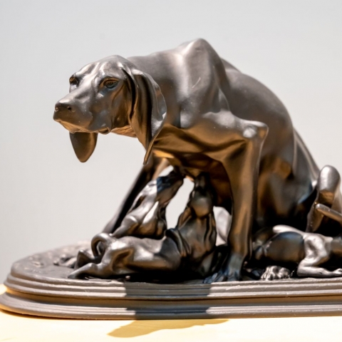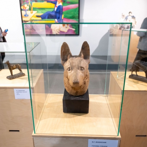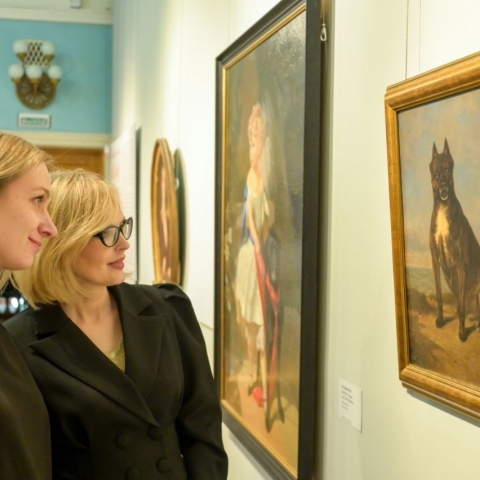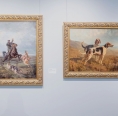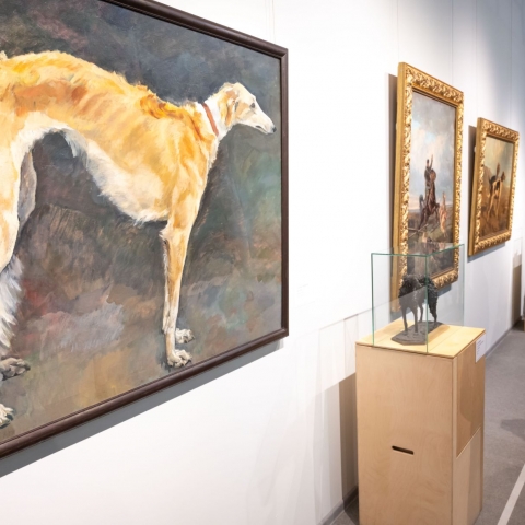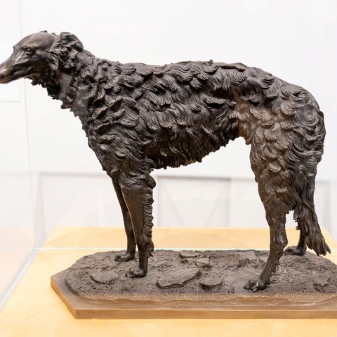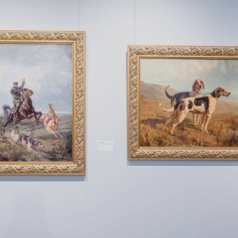 В экспозицию, которая является продолжением проекта «Жизнь замечательных собак», реализованного в 2025 году в Русском музее, вошло 13 экспонатов – картины, а также скульптуры из бронзы, керамики и дерева, созданные в период с середины XIX века по 1999 год. В их числе полотна Рудольфа Френца «Две гончие» (1870) и «Егерь с тремя борзыми» (1872). Художник был «приписан» к императорской охоте с 1870 года, выполняя заказы Александра III и затем Николая II, и всё его творчество было посвящено этому масштабному, зрелищному действу, неотделимой части усадебной жизни, любимому увлечению и развлечению дворянства.